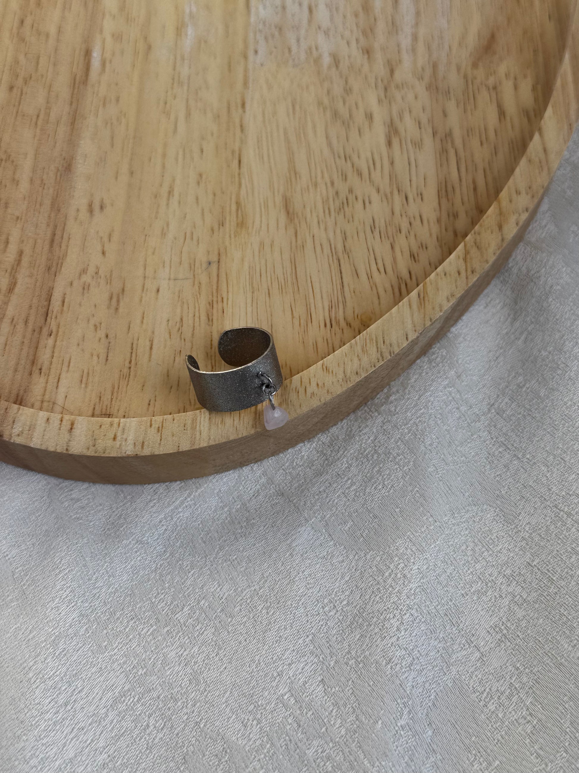 Bague en acier inoxydable argenté avec un pendentif en quartz rose. Modèle ajustable.