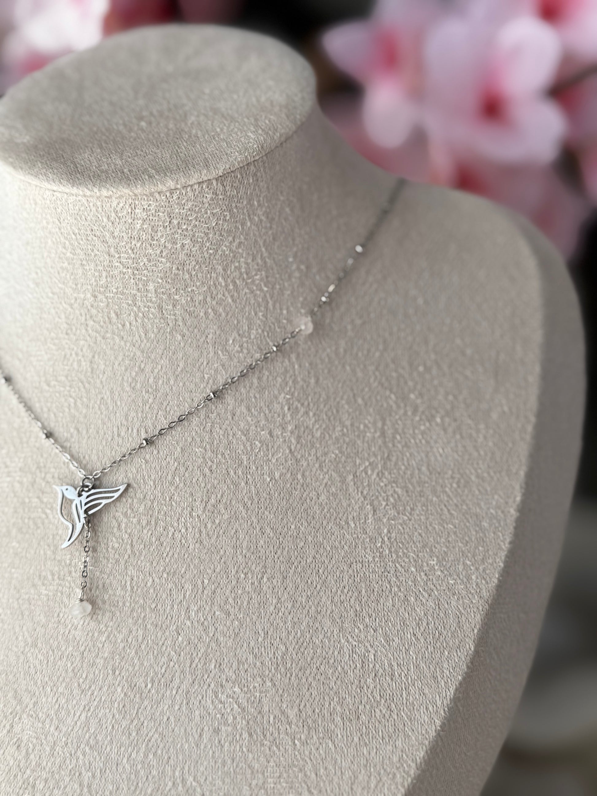 Collier en acier inoxydable argenté avec un pendentif en forme d’oiseau et une perles pendantes.
